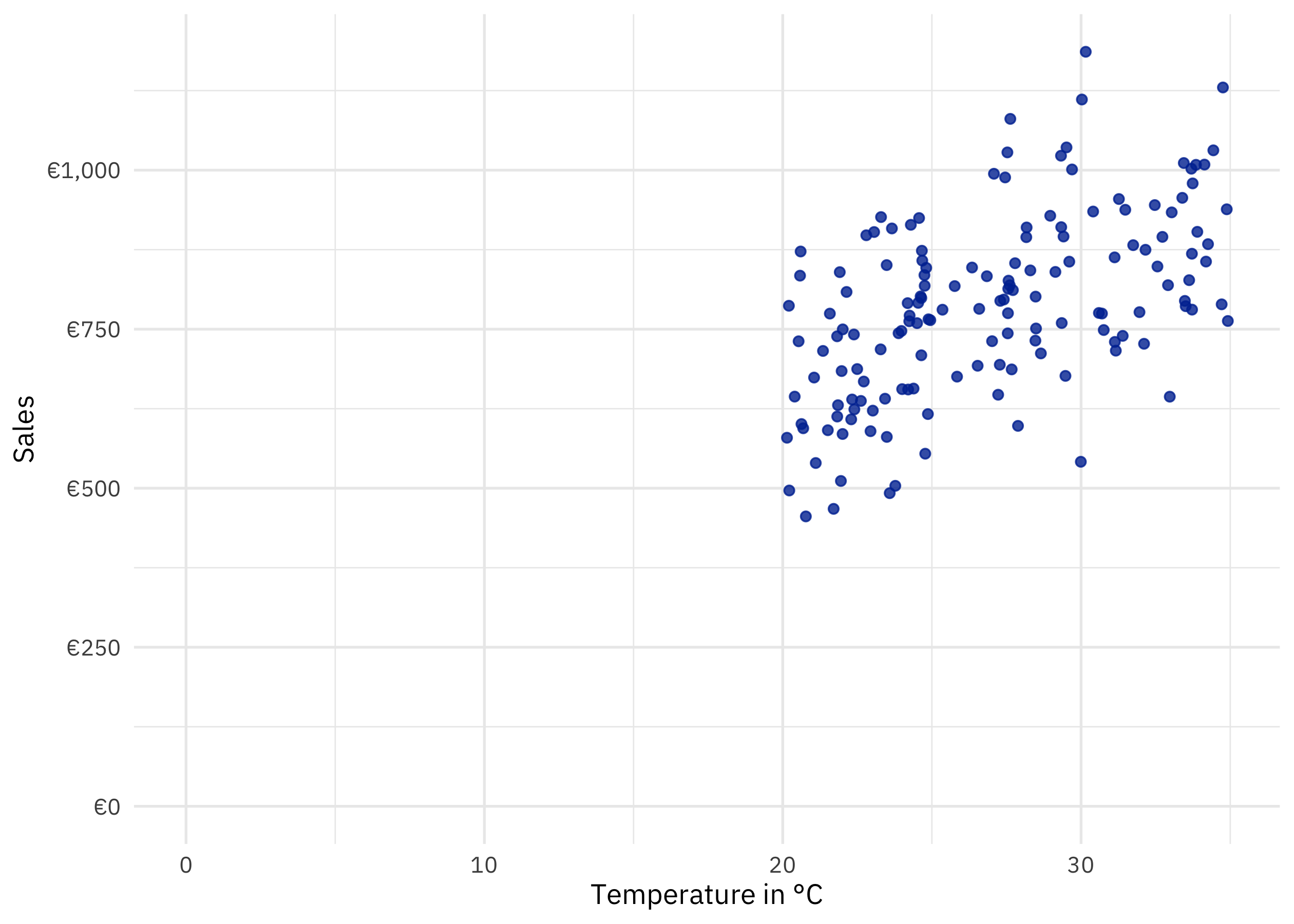 To not over-complicate things, in this example we assume the ice cream is sold in a market with warm temperatures (20°C - 35°C) across the year. Likewise we take the advertising spend into consideration, which is usually not best practice due to seasonality of media costs. That’s why one actually should use an activity metric. But in this example, for the sake of intuition, we remain with the spend. Furthermore the three independent variables are correlated to a a minimum.